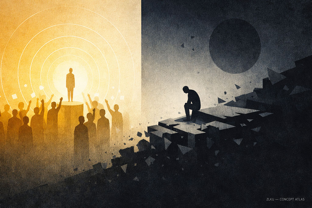 高光回落症(Spotlight Comedown),是指个体在经历短期高强度关注、赞誉或舞台化情境后,心理基准线被短暂抬高;当外部关注退场,个体从情绪峰值迅速回落至常态时,产生明显失落、空虚或自我怀疑,并对普通状态产生难以适应的心理落差。这种“峰值—回落—失衡”的波动若反复出现,即形成一种可复现的情绪循环结构。