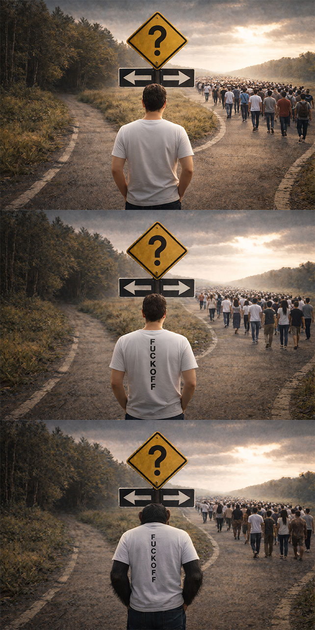 一开始,我只是让它帮我设计一张朋友圈封面图:一个迷茫的中年男人站在岔路口——是选大家都在走的那条路,还是选另一条几乎没人走的路。